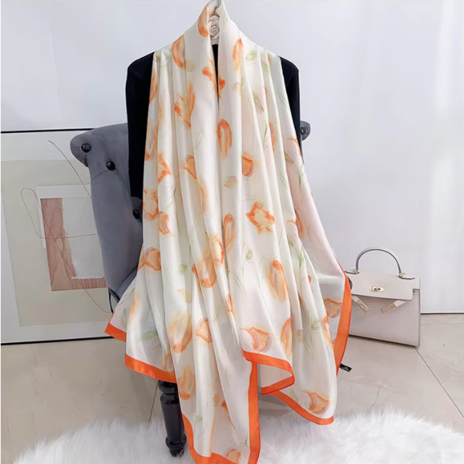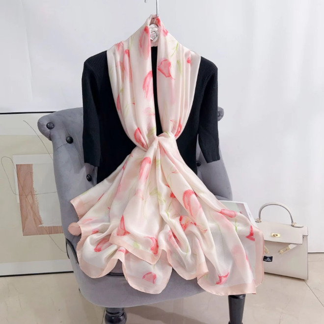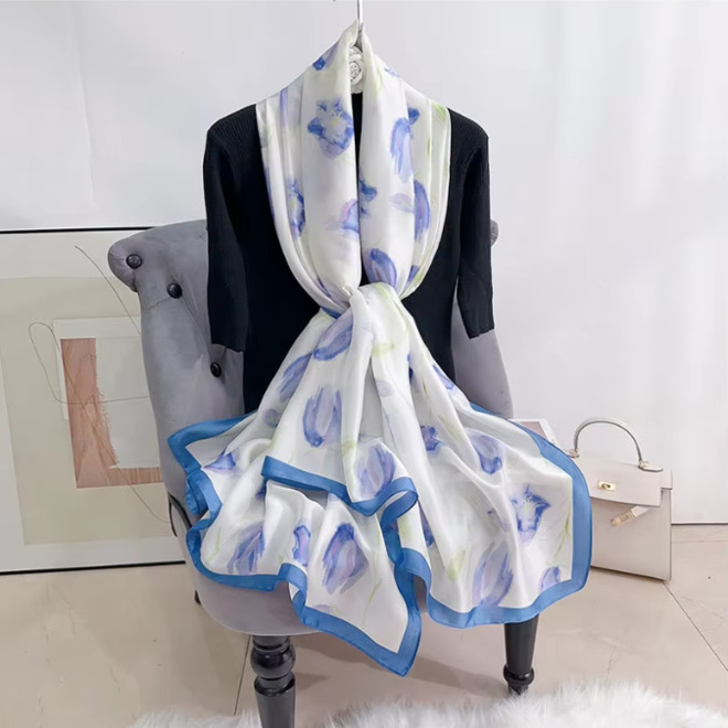 This long satin-finish scarf combines elegant floral design with a smooth, refined texture. Lightweight yet structured, it drapes beautifully and adds a polished touch to both casual and dressy outfits—perfect for daily styling or thoughtful gifting.