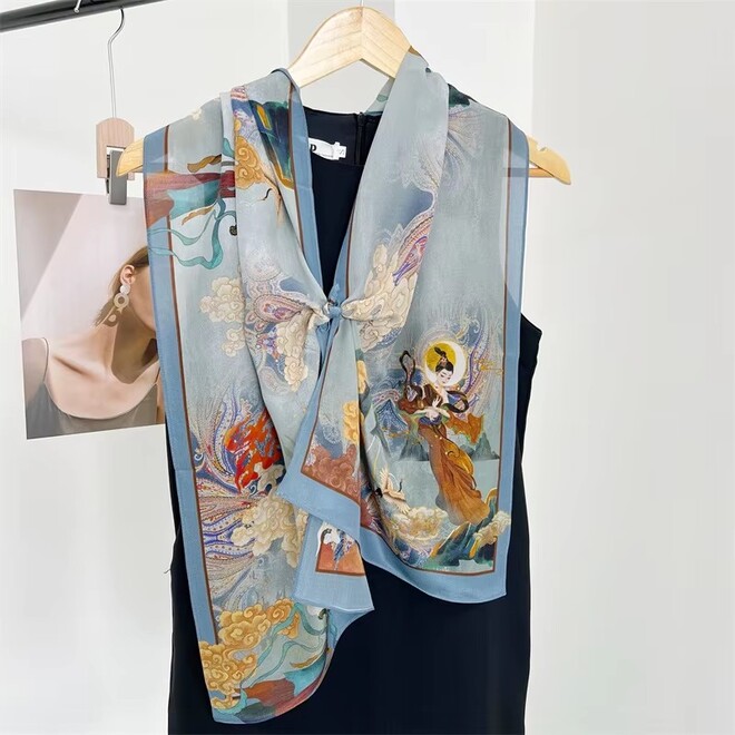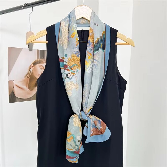 Made from pure silk twill, this scarf offers a naturally soft drape with a subtle sheen that elevates any look. The intricate mythological print adds a unique artistic flair, while the hand-finished edges reflect true craftsmanship—making it a perfect piece for both everyday elegance and refined gifting.