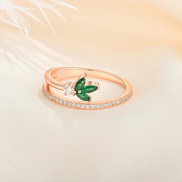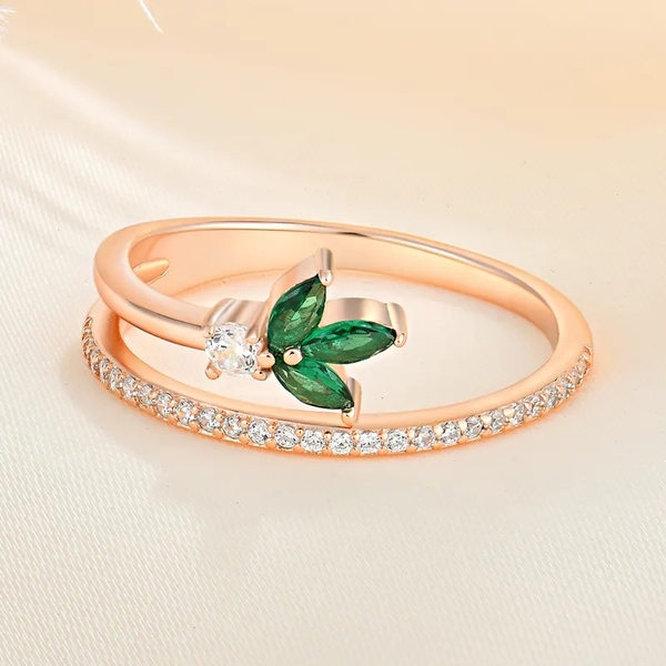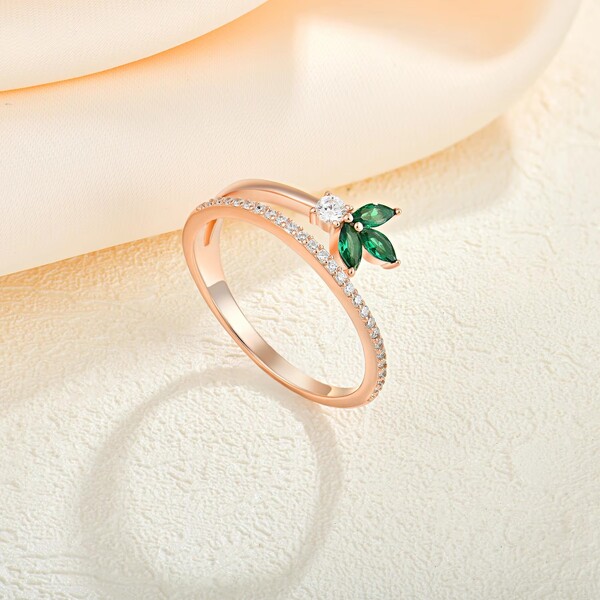Design: Refined double-band structure accented with an emerald-inspired centerpiece and subtle floral detailing